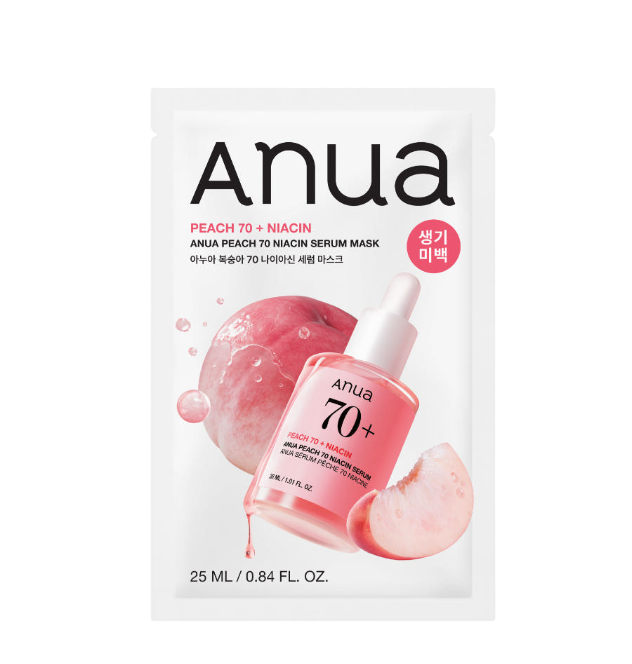 - Contains peach yogurt complex gently removes skin dead cell and leaves the skin smooth and hydrated.![[Anua] Peach 70% Niacinamide Serum Mask-Holiholic](https://cdn.shopify.com/s/files/1/0340/5653/6199/files/Anua_Peach_70_Niacinamide_Serum_Mask-Holiholic.png?v=1768197894)