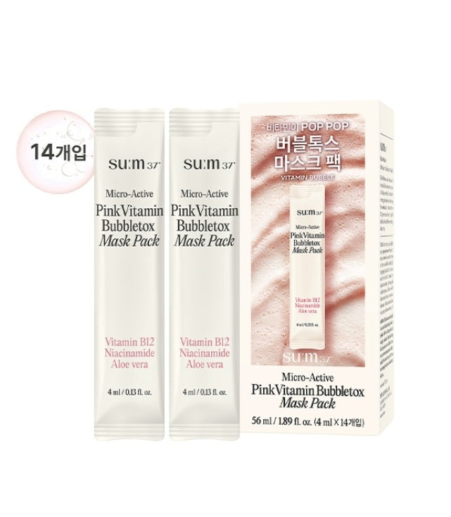 [SU:M 37] Micro-Active Pink Vitamin Bubbletox Mask Pack 14P- This bubble mask has a visible effect for brightening, deep cleansing of pores, sebum control, skin soothing and moisturizing.- Contains Vitamin and Niacinamide for clearer complexion. - It gently cleanses pores and provides nutrients to the skin. - Rich bubble leaves skin smooth...
